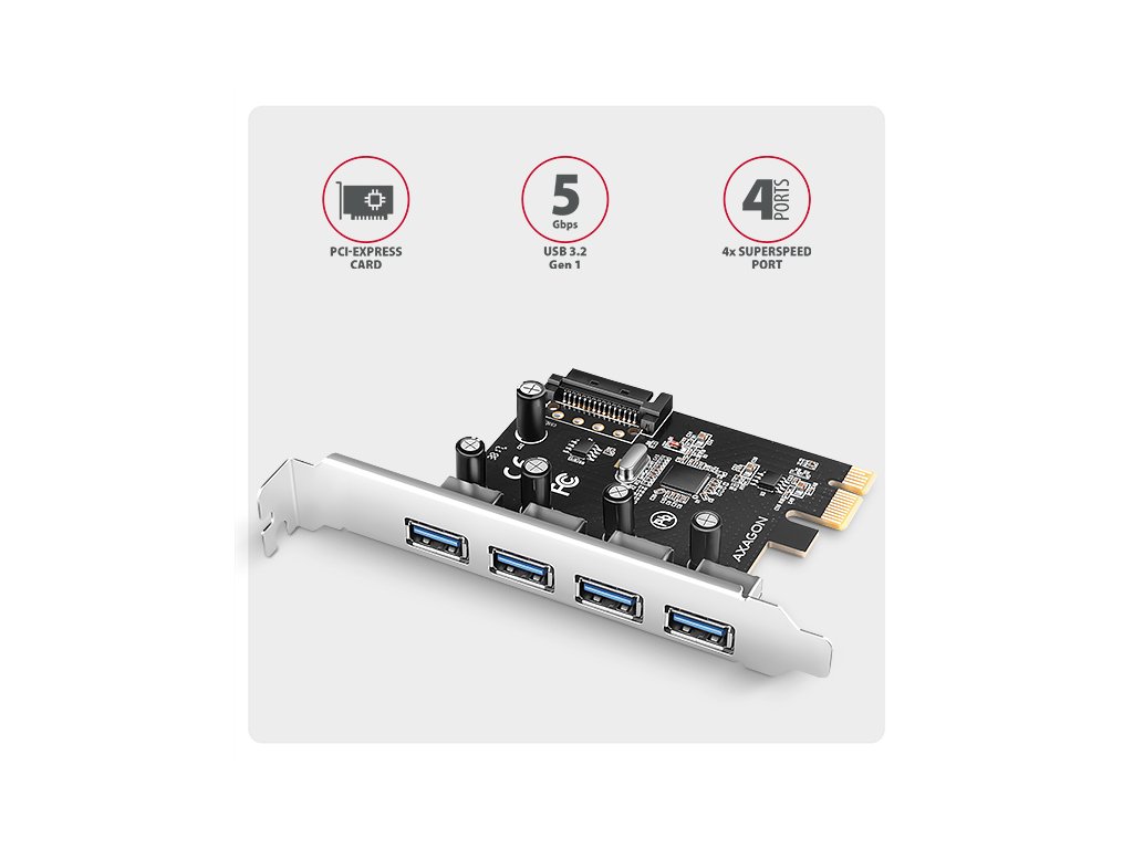 AXAGON PCEU-430RS, PCIe řadič, 4x USB 5Gbps port, SATA napájení, Renesas PD720201, SP