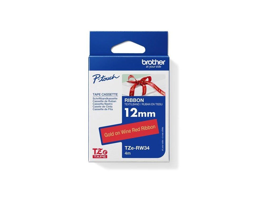 BROTHER TZE-RW34 - kazeta TZ šířky 12mm, TEXTILNÍ páska 4m- pro tvorbu dárků - NELEPÍCÍ -ČERVENÁ PÁSKA ZLATÝ POTISK gold