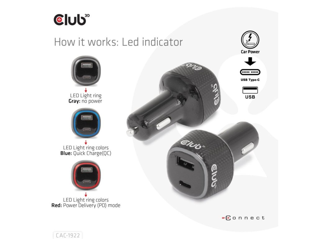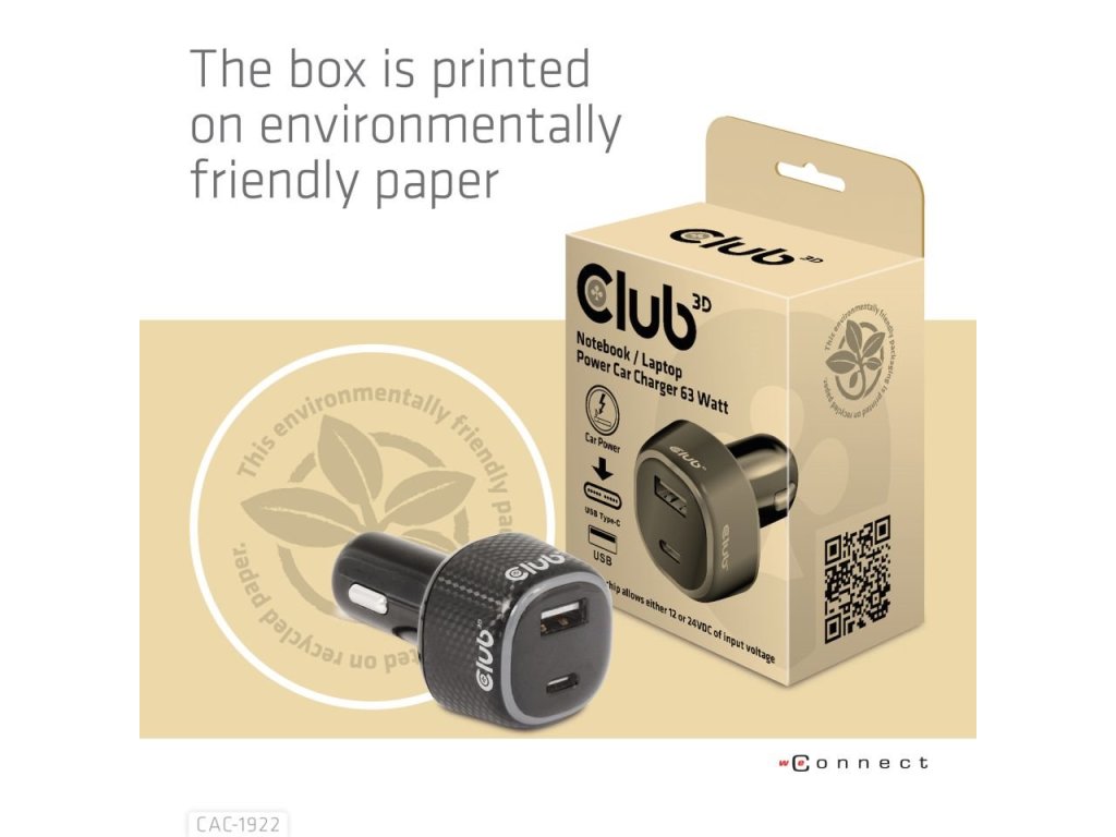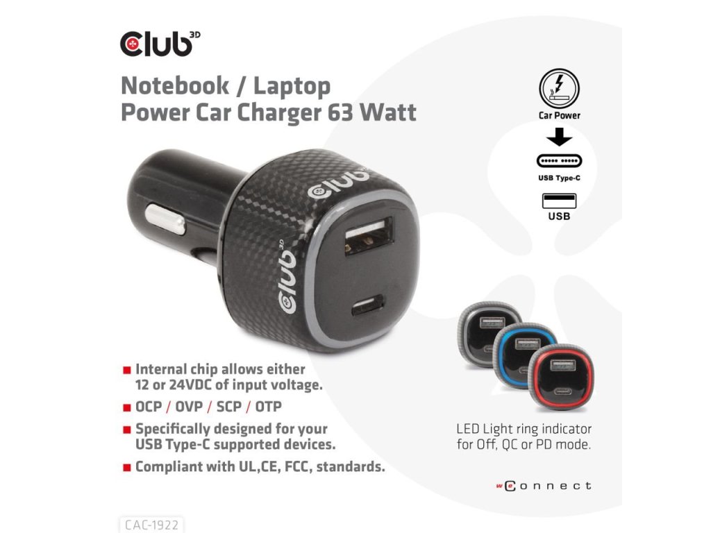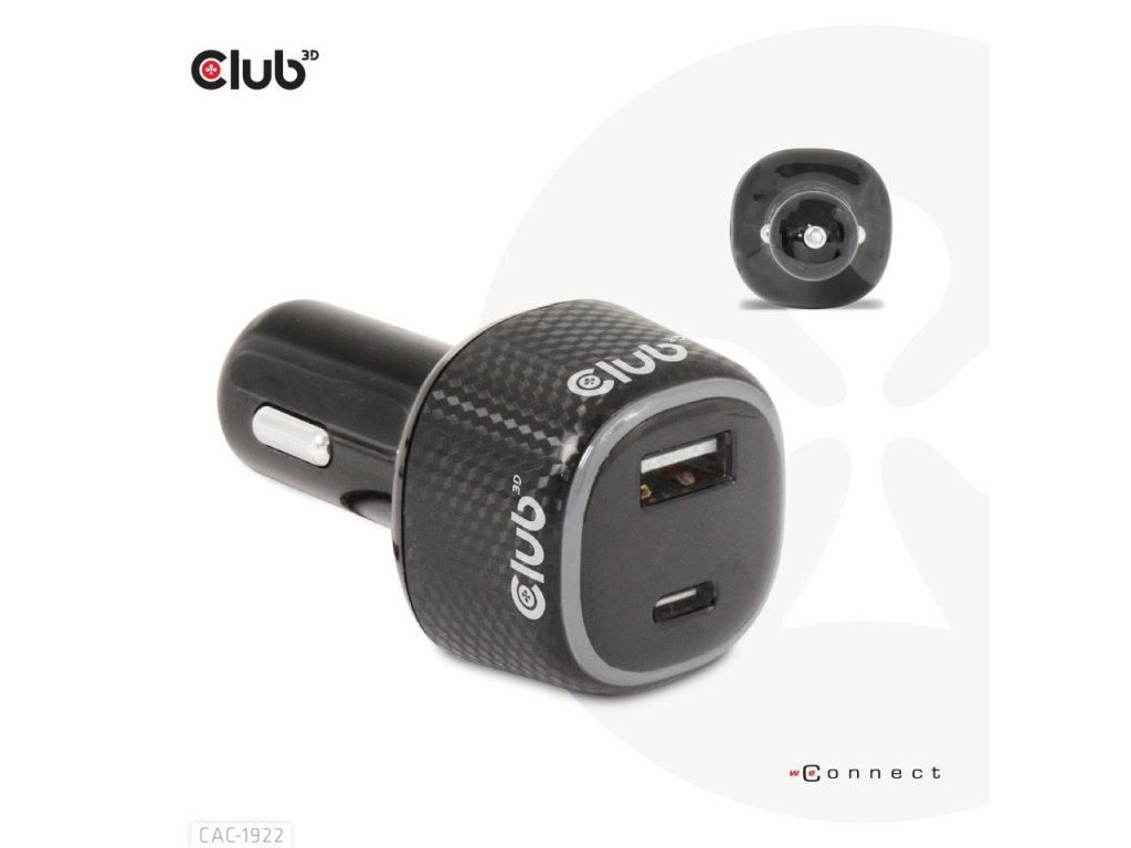 Club3D Auto nabíječka pro Notebooky 63W, 2 porty (USB-A + USB-C)