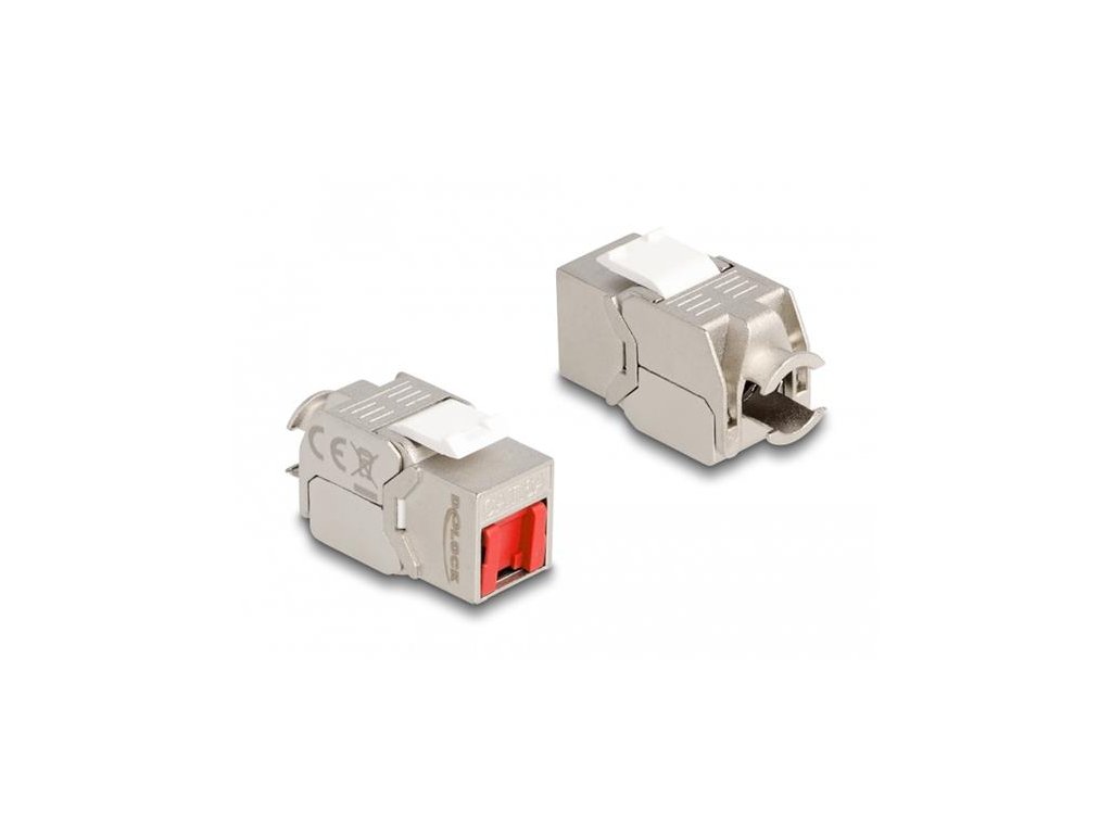Delock Modul Keystone RJ45, ze zásuvky na LSA, Cat.6A, beznástrojový, s červeným protiprachovým krytem