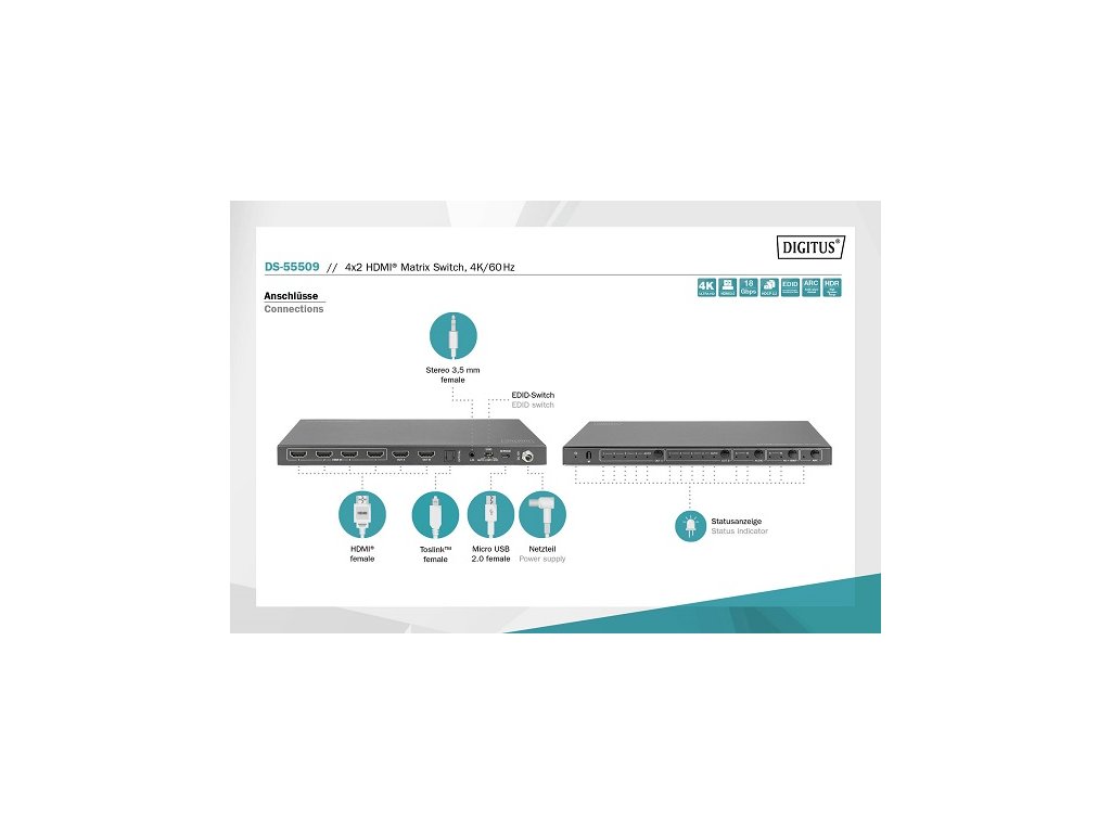 DIGITUS 4x2 HDMI Matrix Switch, 4K/60Hz Scaler, EDID, ARC, HDCP 2.2, 18 Gbps