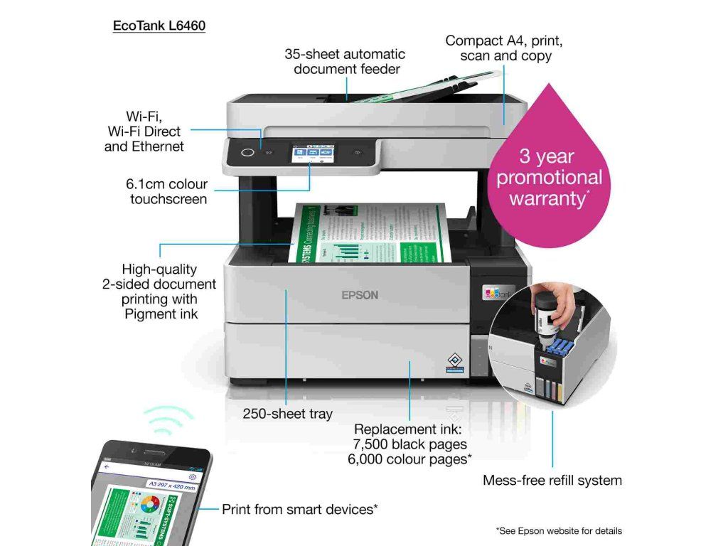 EPSON tiskárna ink EcoTank L6460, 3v1, A4, 1200x4800dpi, 37ppm, USB, Duplex,Záruka 5 let po registraci zdarma