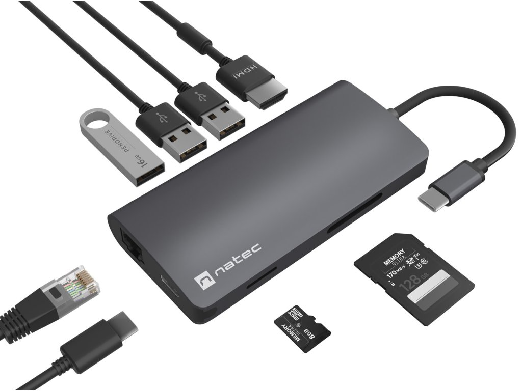 Natec multiport adaptér FOWLER 2 3X USB 3.0 HUB, HDMI 4K, USB-C, RJ45, SD, MICRO SD