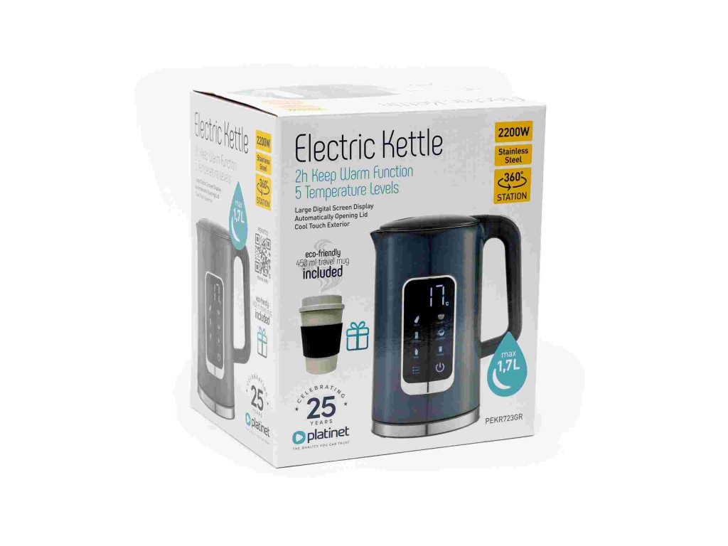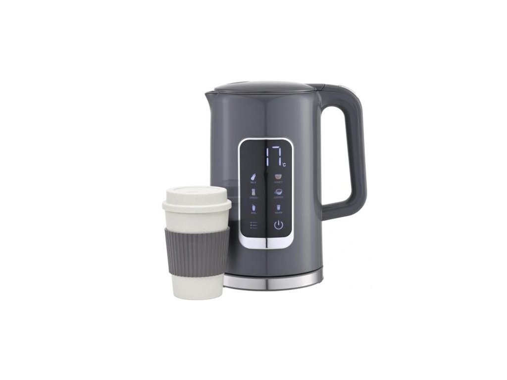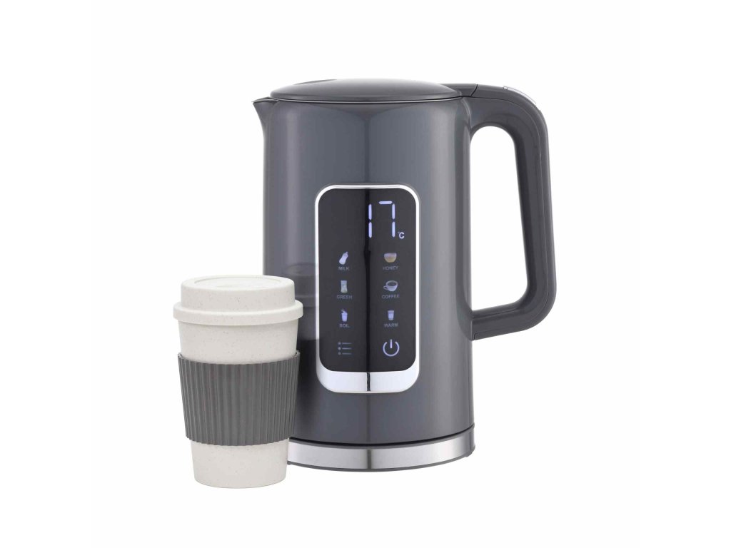 PLATINET RYCHLOVARNÁ KONVICE LCD 1,7L 5 TEPLOT + 450 ML CESTOVNÍ HRNEK, ŠEDÁ