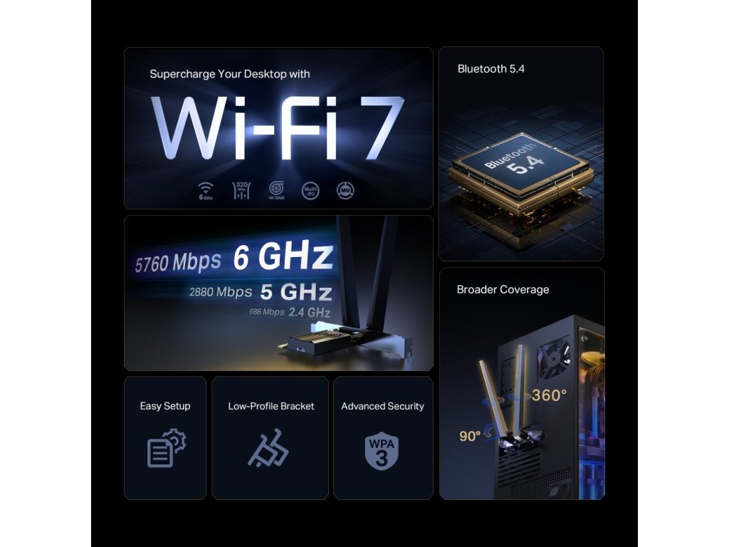 Síťová karta TP-Link Archer TBE552E BE9300 WiFi 7, PCI-e, Bluetooth, odnímatelná anténa