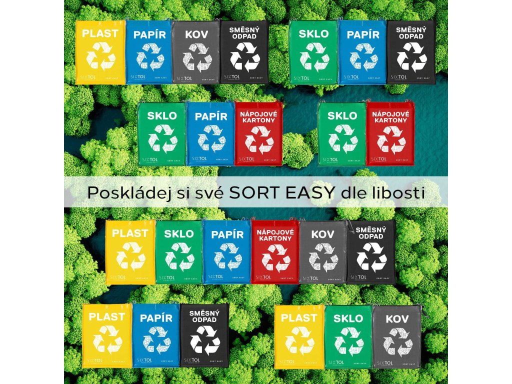 Šikovné tašky na tříděný odpad Sort Easy jsou barevně odlišené podle druhu odpadu – žlutá na plast, zelená na sklo, modrá na papír a šedá na kov. Hodí se do každého bytu, domu, chaty nebo garáže. Tašky jsou vyrobeny z netkané textilie čímž jsou snadno udržovatelné a omyvatelné. Po obou stranách jsou opatřeny suchým zipem, který umožňuje tašky vzájemně pospojovat v libovolném pořadí. Jednotlivé tašky mají objemem 36 litrů. Všechny tašky jsou vybaveny pevnými uchy, takže v momentě, kdy se taška naplní, můžete ji pohodlně odnést a vysypat do příslušného kontejneru. V případě potřeby uskladnění je možné tašky snadno složit naplacato a uklidit, takže zabírají minimum místa.