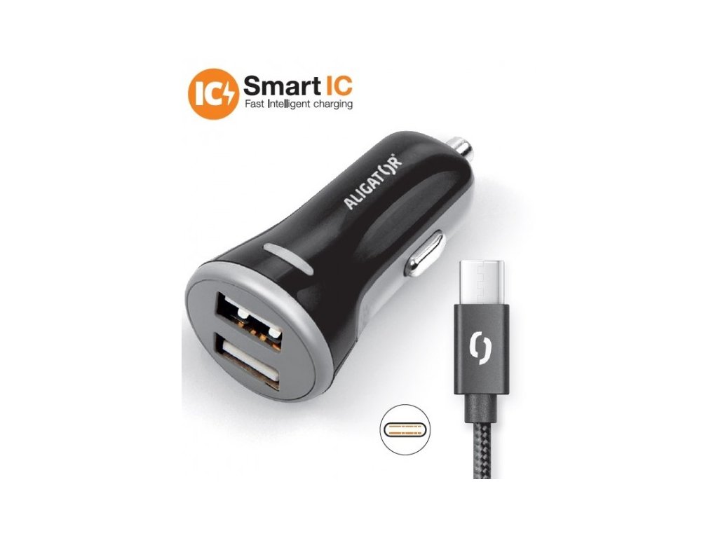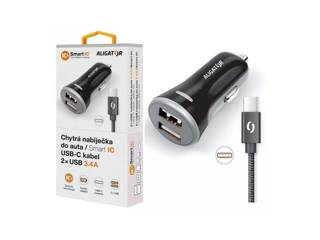 ALIGATOR Chytrá nabíječka do auta 3.4A, 2xUSB, smart IC, černá, USB-C kabel