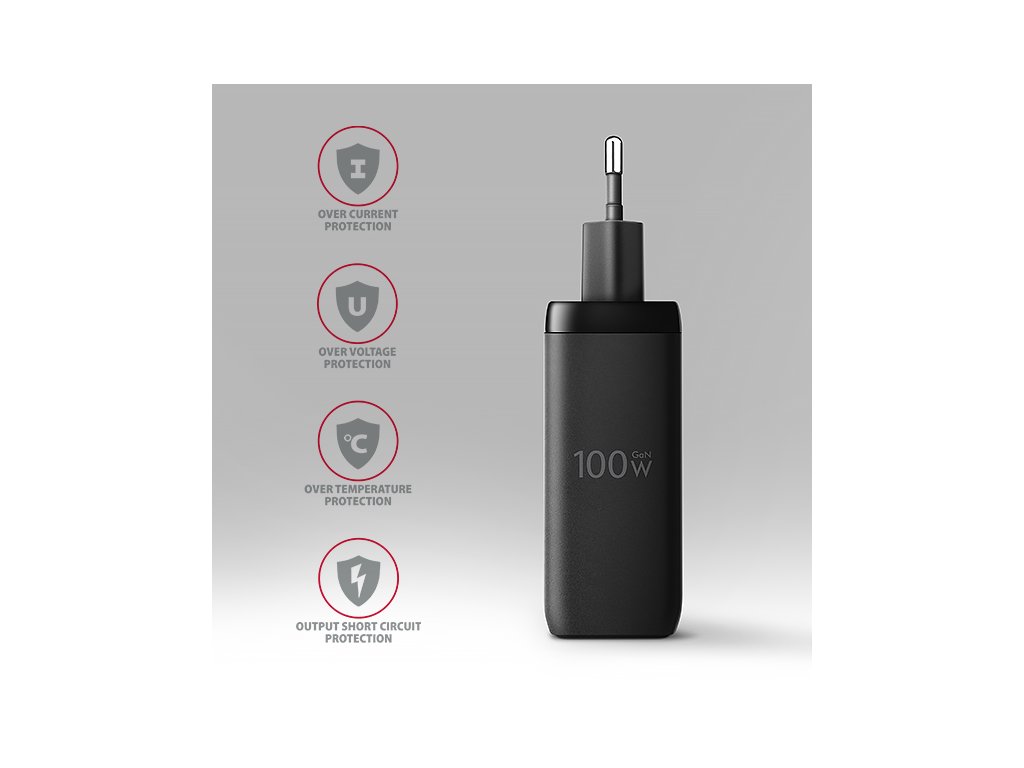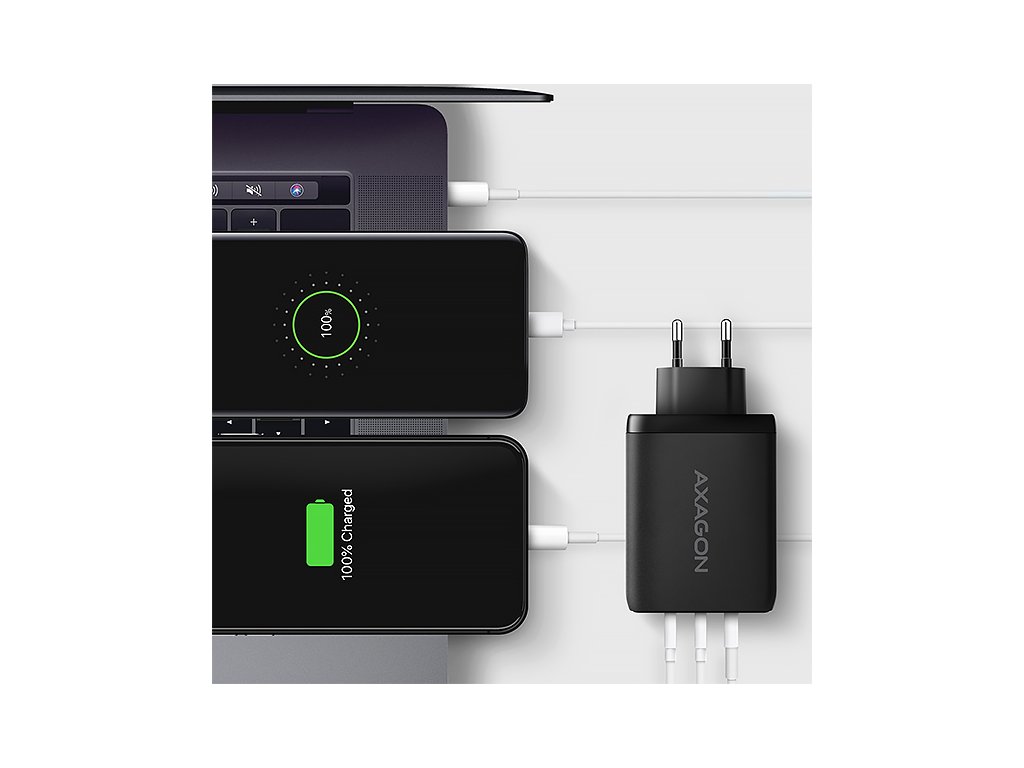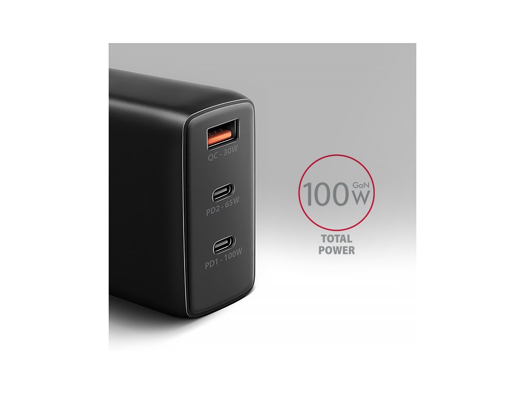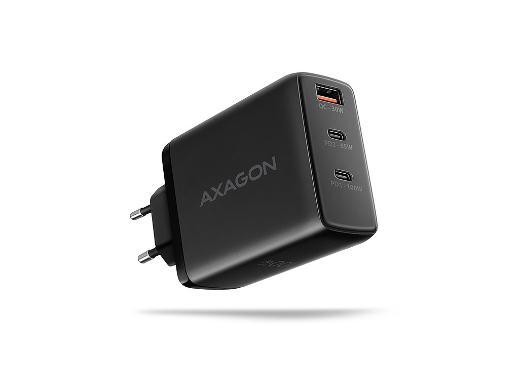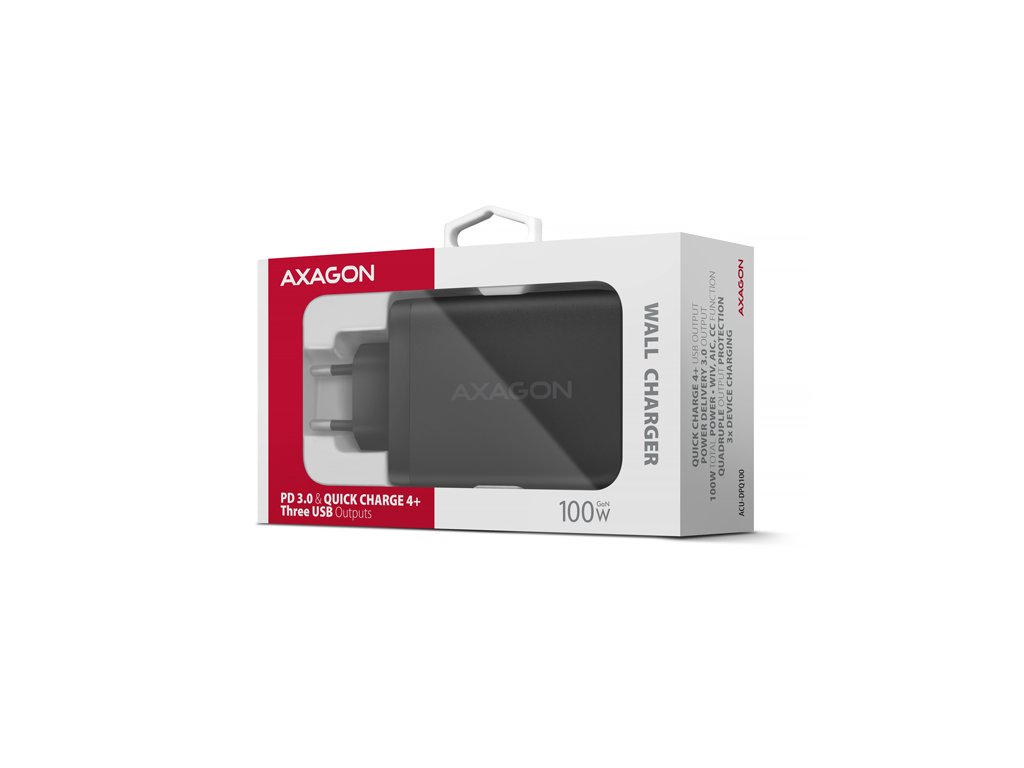 AXAGON ACU-DPQ100, GaN nabíječka do sítě 100W, 3x port (USB-A + dual USB-C), PD3.0/PPS/QC4+/Apple, černá