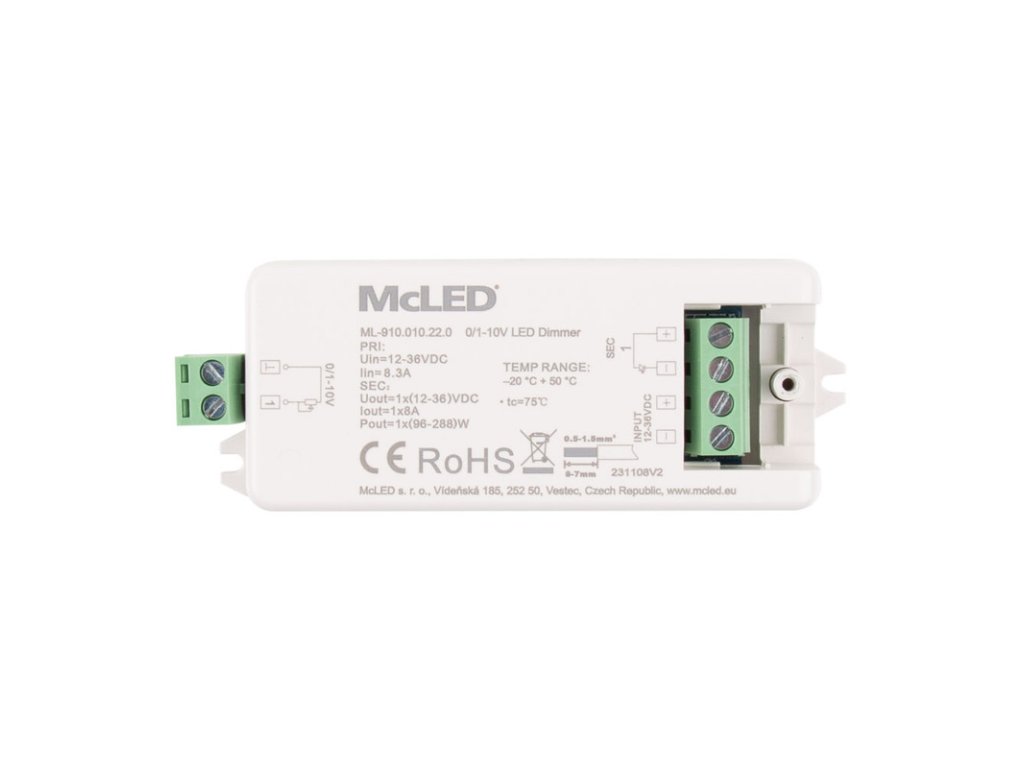 MCLED Stmívač pro řízení jasu stmívání odporem do 500 kΩ 0/1-10V 1 kanál 8A