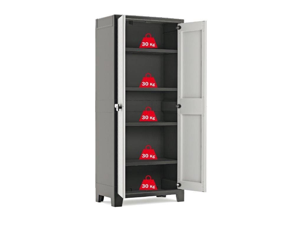 Skříň obsahuje celkem 4 přídavné police – každá s výraznou nosností až 30 kg. Hodí se tedy pro skladování i výrazně těžších předmětů. Můžete využít také její zesílené dno, které unese stejnou váhu jako police. Uskladněte do ní dílenské nářadí, zahradnické potřeby, pomůcky a prostředky pro úklid či praní nebo na poličky vyskládejte zavařeniny (marmelády, kompoty, pyré). Výšku poliček si navíc zvolíte podle velikosti uložených předmětů.