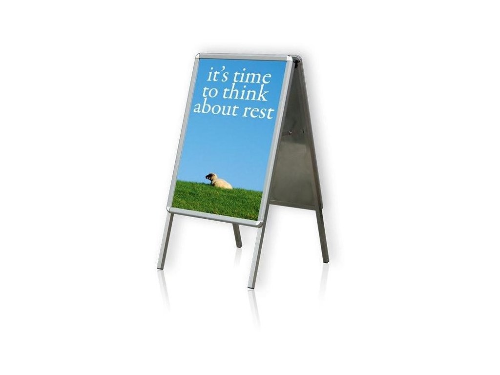 Oboustranná reklamní tabule, tzv. "áčko" je dostupnou alternativou jak upozornit zákazníka na právě probíhající akci nebo sdělit důležité informace.Reklamní plochu o velikosti A2 (420 x 594 mm) nikdo nemine bez povšimnutí! Poutač má kulaté rohy a rychloupínací systém umožňuje snadnou výměnu plakátu.