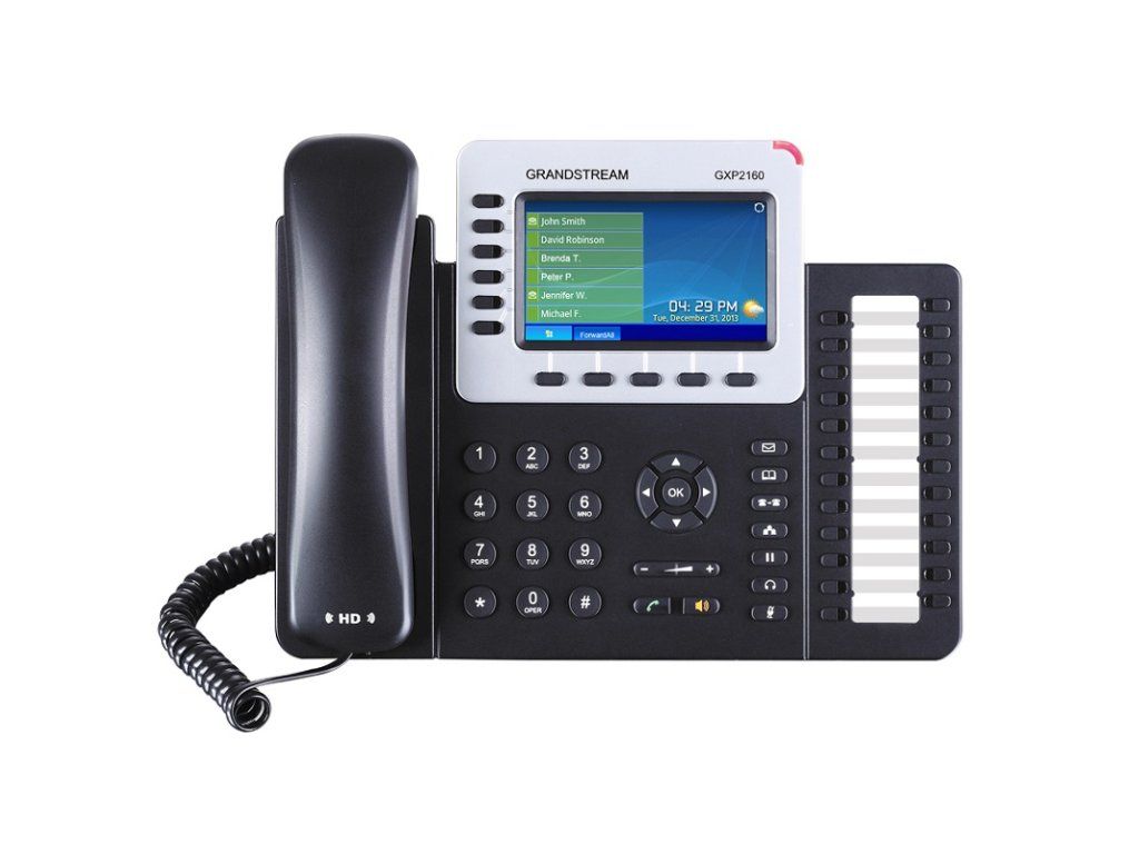 Telefon Grandstream GXP-2160 VoIP telefon je určen do podnikové sféry, umožňuje až 6 SIP účtů a konferenční hovory až 5 účastníků. Je vybaven 5 programovatelnými XML tlačítky, 24 BLF tlačítky rychlé předvolby a 4,3“ LCD displejem. Má integrovanou podporu HD audia pro vysokou kvalitu přenosu. V jeho výbavě nechybí ani bluetooth, USB a EHS pro případné připojení headsetu od Plantronics.Specifikace: