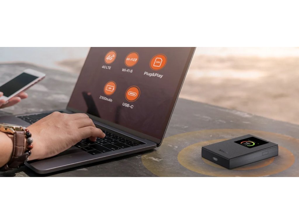 Bezdrátový 4G LTE / 3G bateriový router s Wi-Fi 6 (802.11ax/b/g/n). Baterie 2100mAh, výdrž až 8,5 hodin. Přehledný displej 1,44" pro informace o provozu. Slot pro nanoSIM. 4x LED indikace, podpora WPA3 / WPA2 / WPA. Port USB-C pro nabíjení.