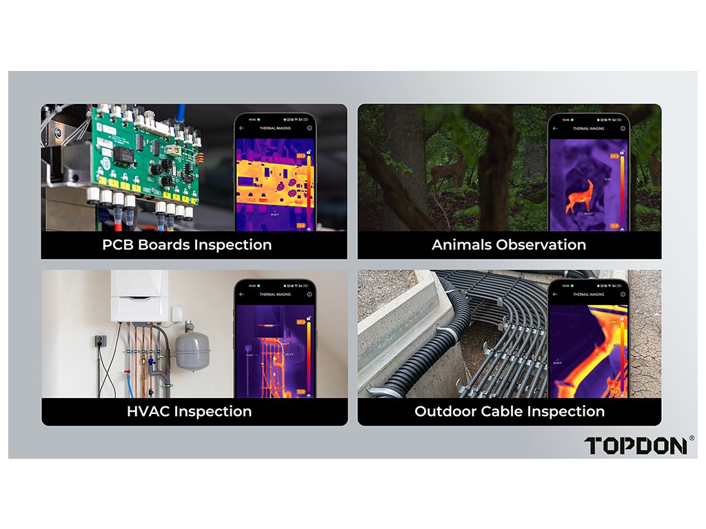 Termokamera TS001 s dlouhým ohniskem pro systém Android byla navržena pro zachycení ostrých snímků i na velmi krátké vzdálenosti, například při inspekci desek plošných spojů. Díky infračervenému snímači s vysokým rozlišením 256 × 192 pixelů a plynulé snímkové frekvenci 25 Hz dokáže precizně zachytit každý detail. Nastavitelný 9mm objektiv umožňuje pokrytí vzdáleností od 0,1 do 500 metrů, což zajišťuje širokou škálu využití, včetně inspekcí budov, pozorování zvířat, oprav automobilů nebo kontroly desek plošných spojů.