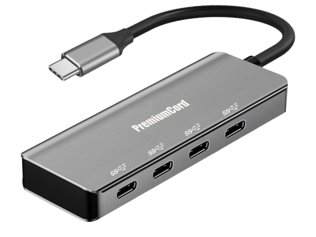 USB hub PremiumCord využijete pro připojení klávesnice, myši, SSD, flash paměti, CD-R/RW, pevného disku, web kamery a čtečky paměťových karet. Propojíte s ním všechna možná USB zařízení s maximálním datovým přenosem až 10 Gbps. Hub je vybavený celkem 4 konektory USB 3.2 typu C.