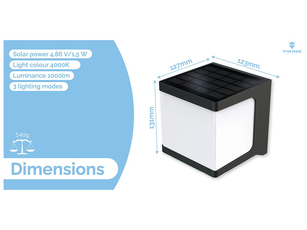 Svítivost 1000 lm • solární napájení • barva světla 4000K (denní bílá) • 3 režimy osvětlení • doba osvětlení za nevhodných podmínek více než 10 dní • odolnost IP54 • kapacita baterie 3,7V/7,4 Wh • výkon solárního panelu 4,86 V/1,5 W