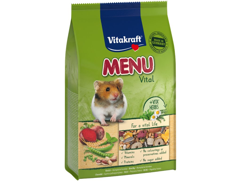 Menu je naše osvědčené hlavní krmivo s cennými obilovinami, kvalitními semeny, chutnou zeleninou a ořechy pro zdravou celkovou výživu křečků. Je obohaceno o VITA® HERBS, pečlivě vybranou směs cenných bylin jako tymián, máta, ibišek a květy heřmánku, které mohou podporovat pohodu zvířat.